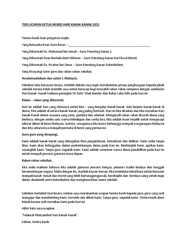 Kamu diminta berucap dalam majlis tersebut bagi mewakili rakan-rakan kamu. Teks ucapan murid sempena hari guru. Doa Sempena Hari Kanak Kanak Pdf.